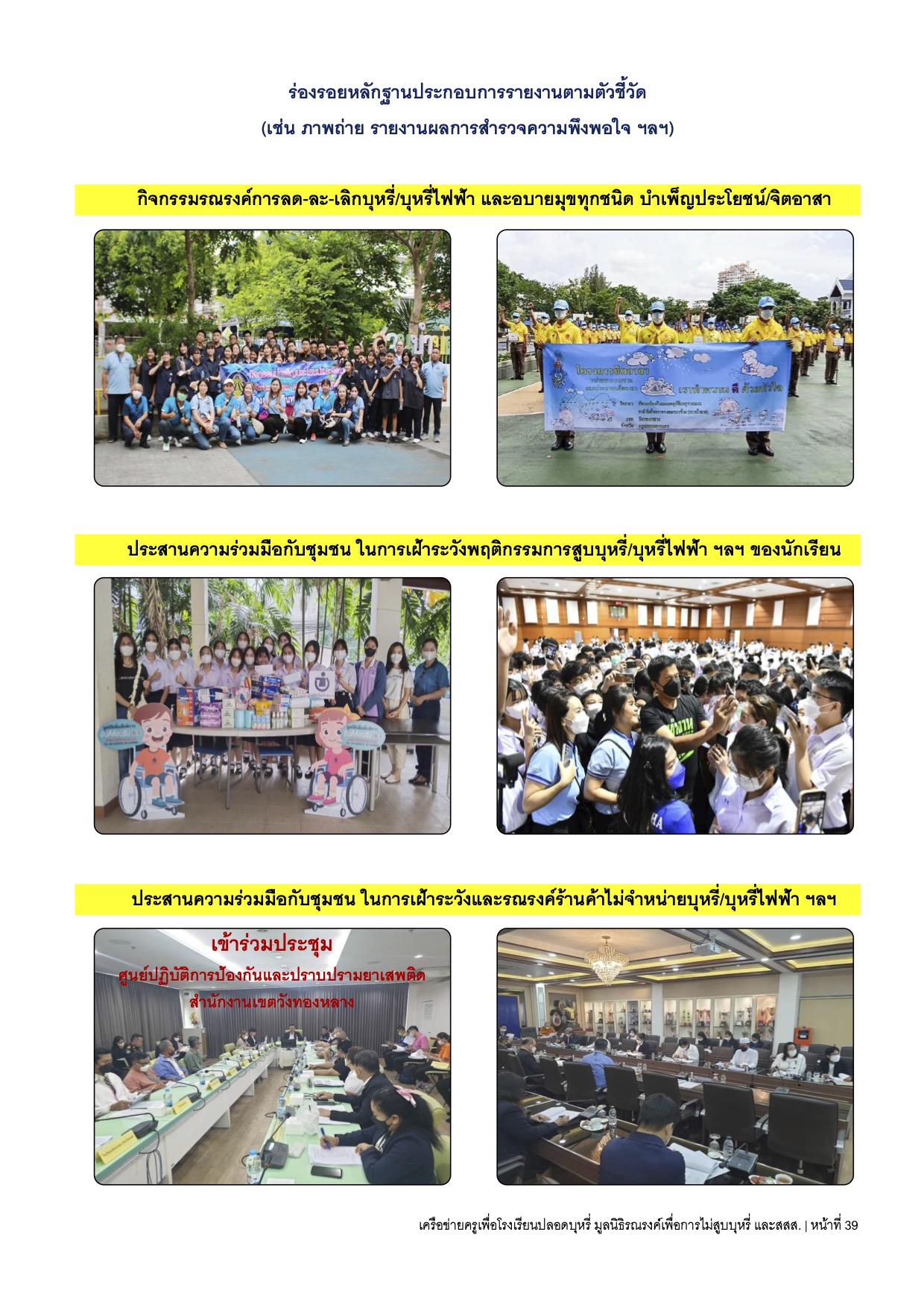 | ด้านที่ 3 ด้านสถานศึกษา | – รายงานผลการดำเนินงานพัฒนาระบบข้อมูลสารสนเทศของสถานศึกษา – รายงานการใช้สื่อเพื่อการจัดการเรียนการสอน – แพลตฟอร์มการเรียนรู้ออนไลน์ – ภาพการนิเทศการจัดการเรียนรู้ – ภาพระบบอินเทอร์เน็ตที่เสถียร ครอบคลุมพื้นที่การเรียนรู้ และมีอุปกรณ์ ICT เพียงพอ |