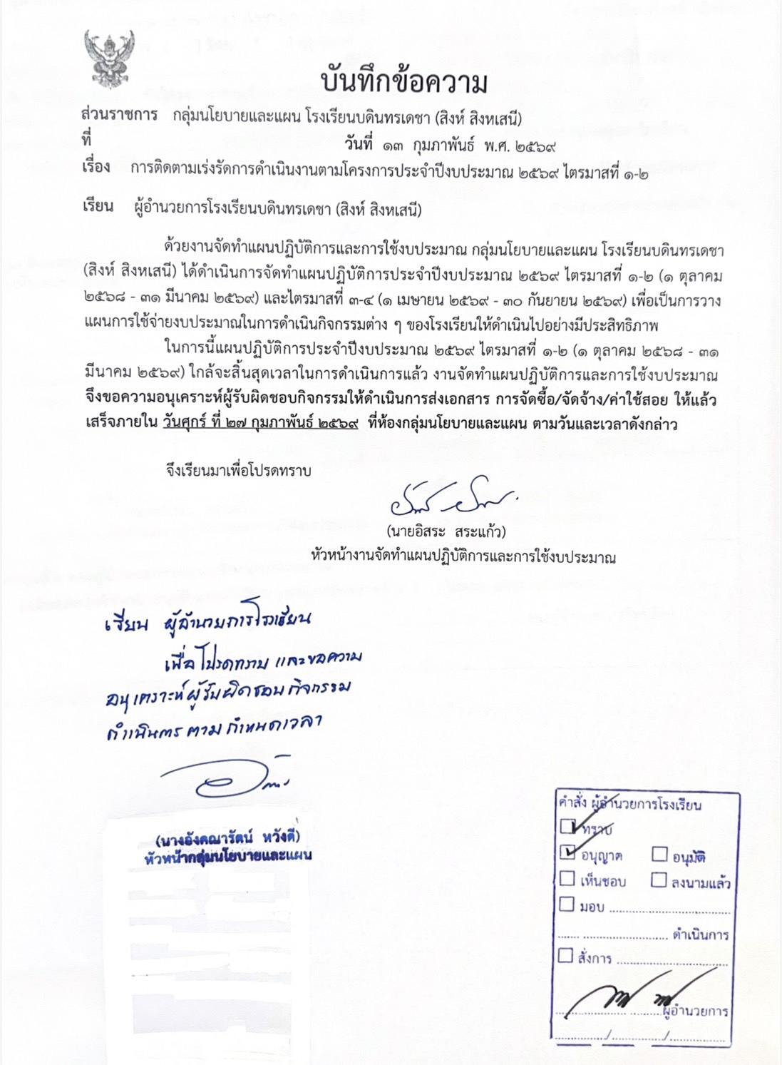 | การประเมินการปฏิบัติงานด้านการเงิน การบัญชีของสถานศึกษา ที่ปฏิบัติตามคู่มือการบัญชี สำหรับหน่วยงานย่อย พ.ศ. 2515 ประจำปีงบประมาณ 2569 | – แผนปฏิบัติการประจำปีงบประมาณ – บันทึกข้อความรายงานการใช้เงิน – บันทึกข้อความเร่งรัดติดตามการใช้เงิน – รายงานผลการดำเนินโครงการ – แผนงบประมาณที่ผ่านการเห็นชอบของคณะกรรมการสถานศึกษา – ตารางการวิเคราะห์โครงการ กลยุทธ์ และมาตรฐานการศึกษา – คำสั่งแต่งตั้งคณะกรรมการเก็บรักษาเงินโรงเรียน – คำสั่งแต่งตั้งเจ้าหน้าที่การเงิน เจ้าหน้าที่บัญชี – เอกสารการเงินการบัญชีของสถานศึกษา