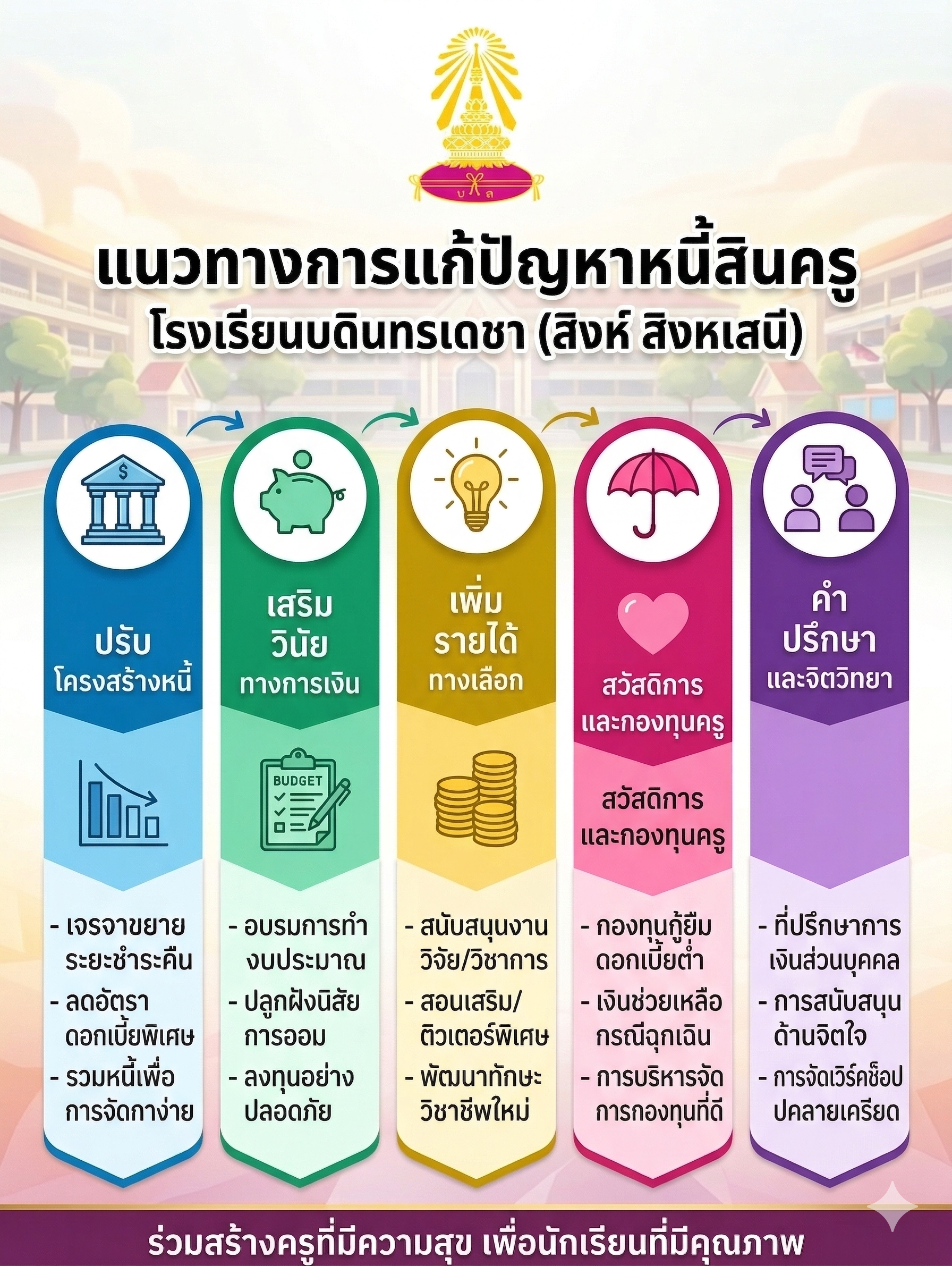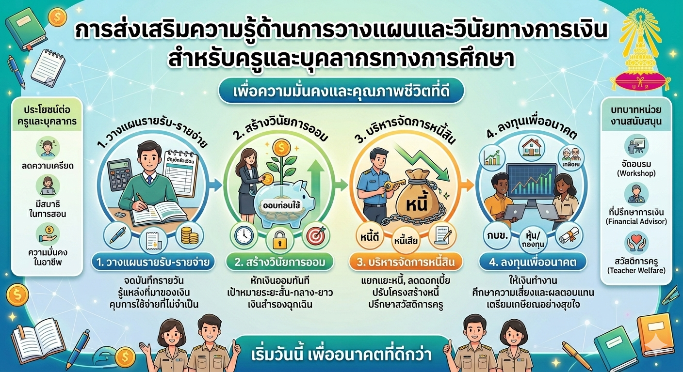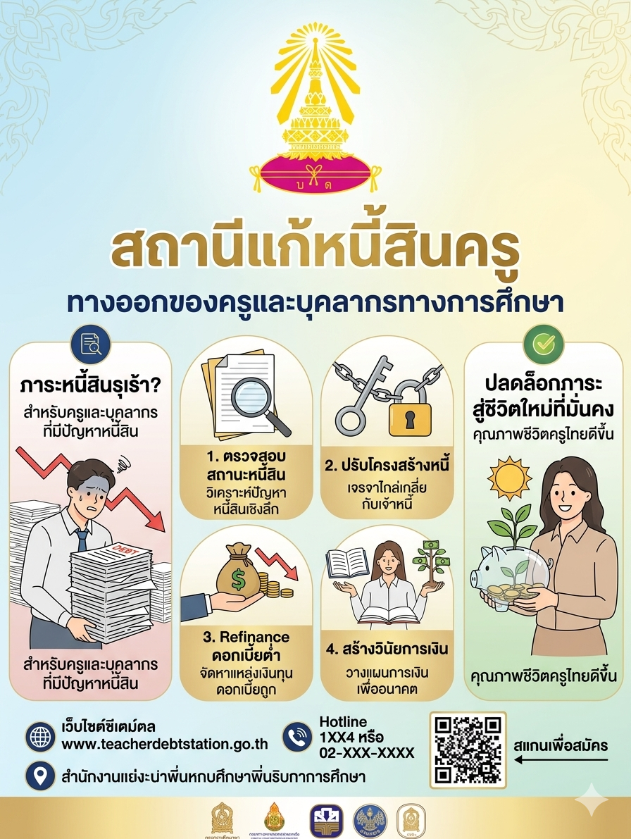 4.2) การส่งเสริมสนับสนุนการแก้ไขปัญหาหนี้สินครูและบุคลกรทางการศึกษาอย่างเป็นระบบ โดยเน้นการให้ความรู้ ด้านการวางแผนทางการเงิน การเจรจาปรับโครงสร้างหนี้ และการจัดตั้งกลไกช่วยเหลือที่เป็นธรรม